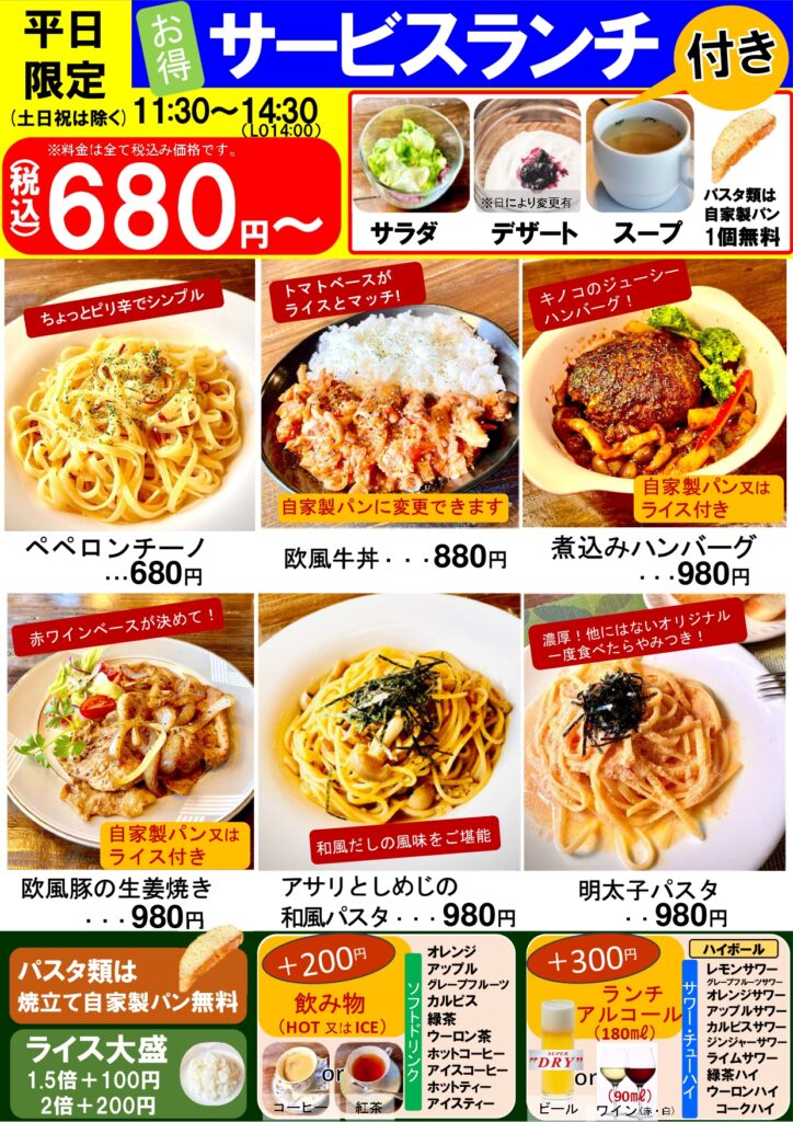 大盛 (パスタ、具ともに)1.5倍 ✙340円 2倍ダブル✙780円
